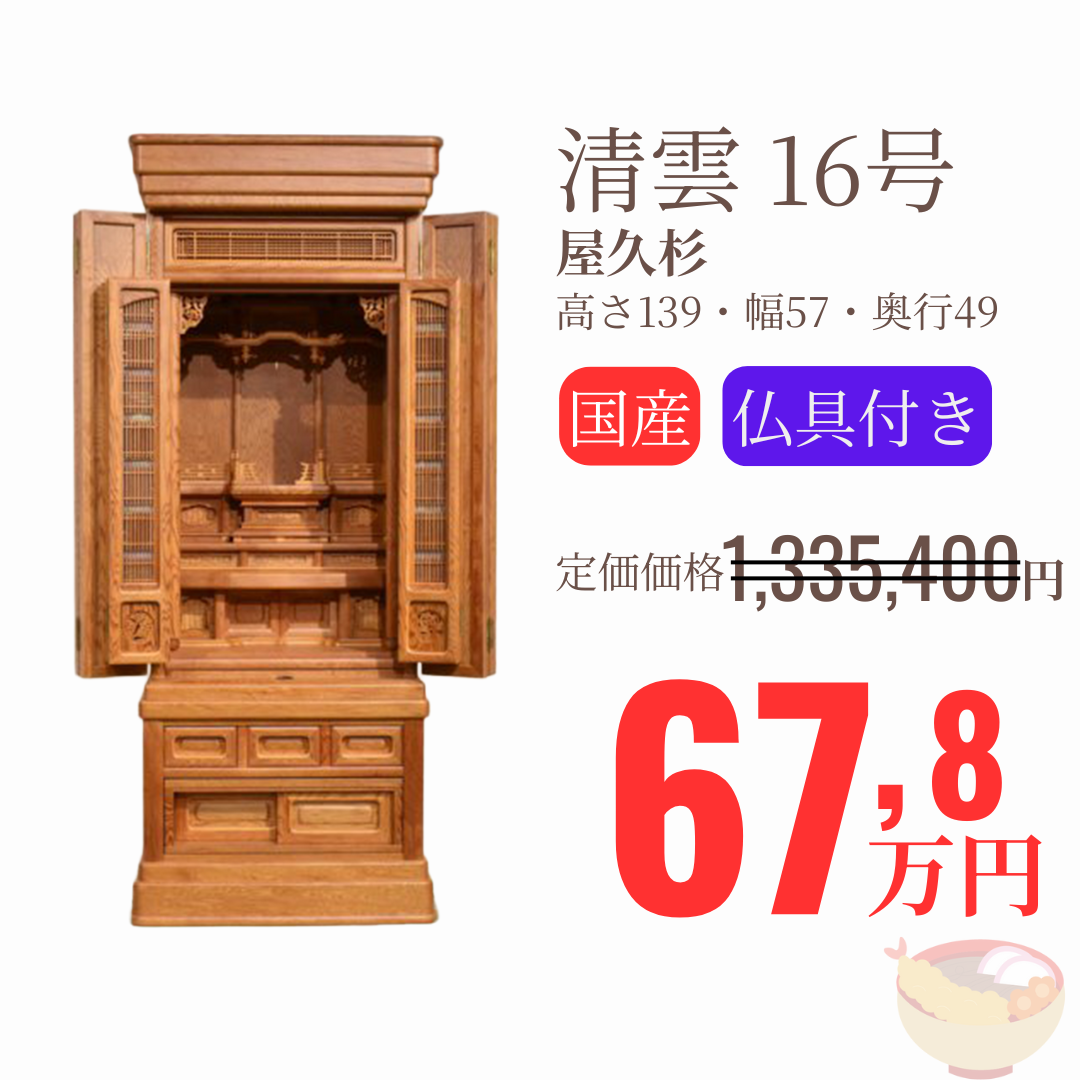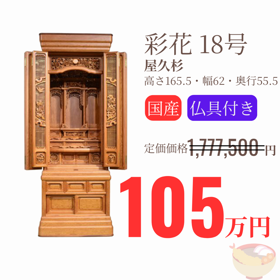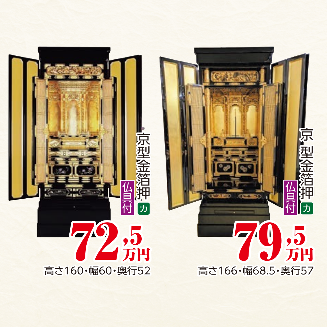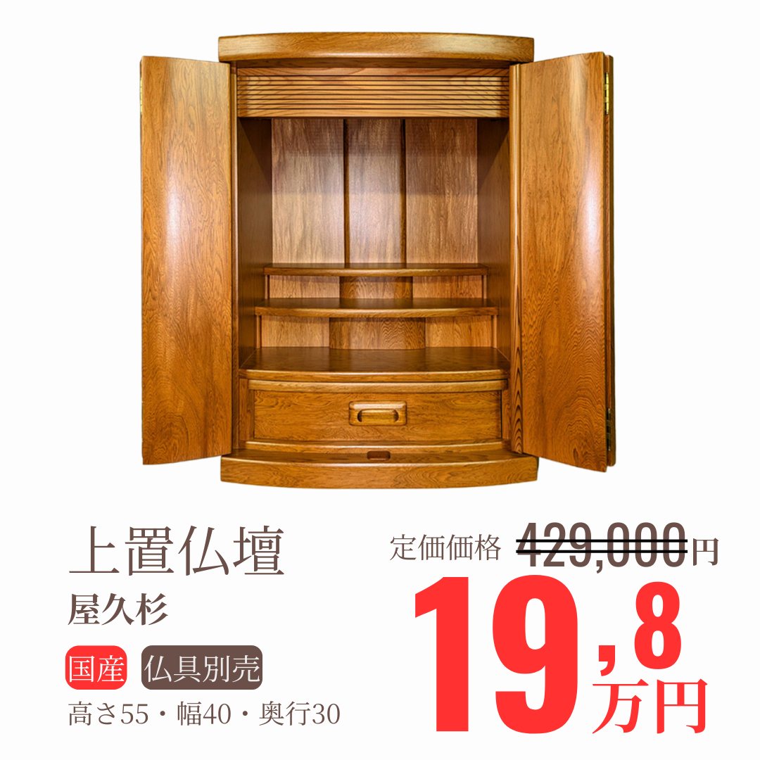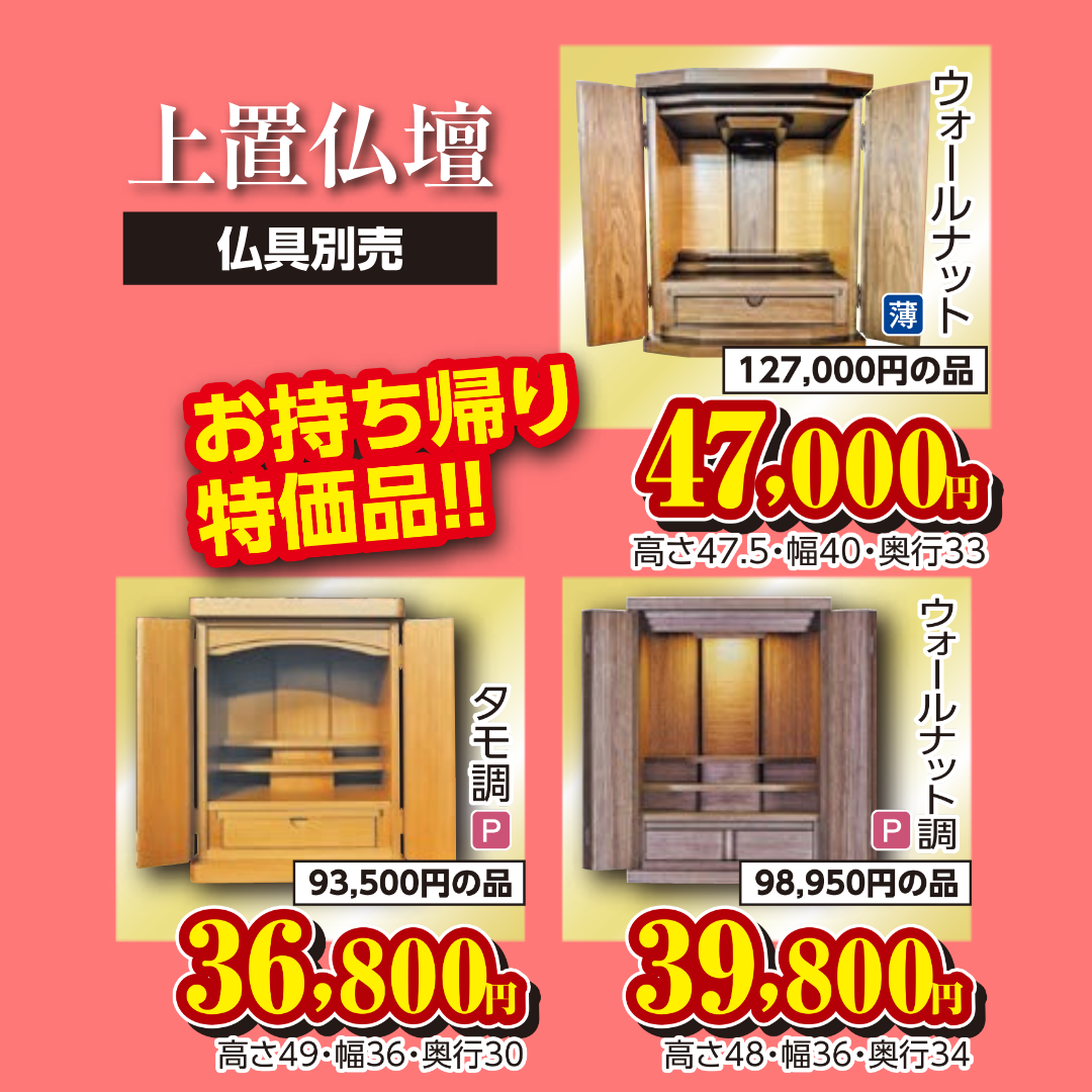 豊富なお仏壇を特別価格でご案内!展示商品から一押し商品を紹介いたします。当店のネットショップには掲載のない、ご来店限定ならではの商品もございますので、ぜひご覧ください。 ※一部商品は在庫僅少につき、現品限りの場合がございます。
